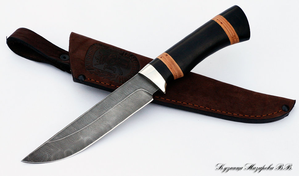 Нож Назарова Овод 2 сталь Дамаск (мельхиор, черный граб, береста)