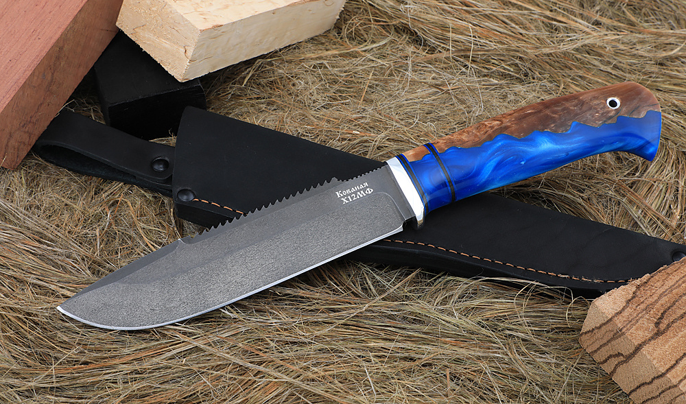 Нож Ворсменский Таёжный сталь Х12МФ, карельская береза, искусственный камень синий