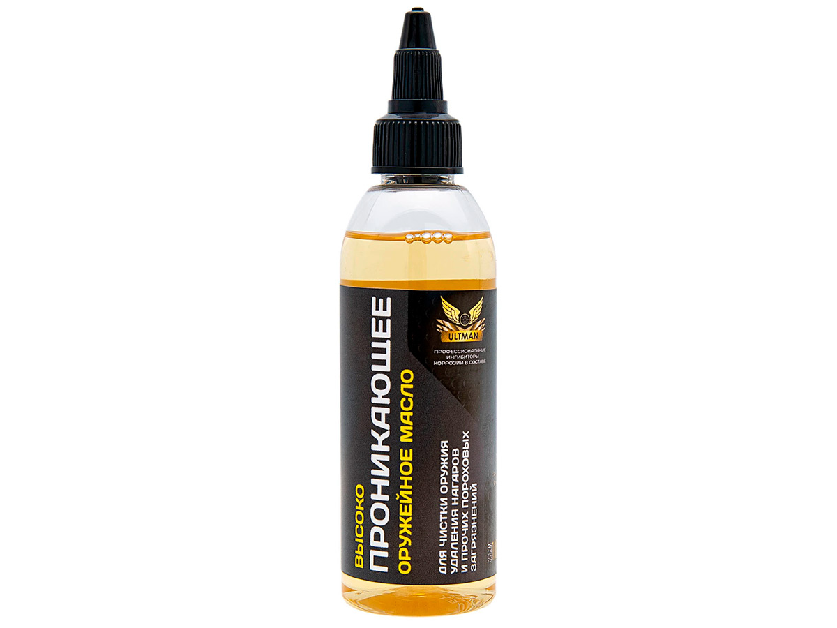 Высокопроникающее оружейное масло Ultman применяется для очистки ствола оружия от пороховых нагаров, вытеснения влаги и защиты от коррозии. Масло способно проникать даже в самые мелкие трещины, растворять нагары и удалять ржавчину. Рекомендовано использовать для финишного удаления остатков химии для чистки оружия, деактивируя все активные компоненты и защищая ствол от коррозии.
