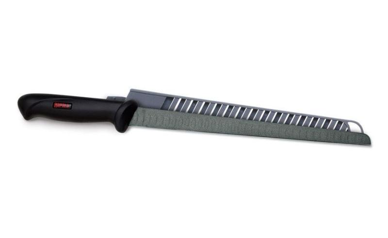 Нож из нержавеющей стали с тефлоновым покрытием отлично справится с филетированием рыбы. Тефлоновое покрытие и волнистая форма клинка не позволяют кускам филе прилипать к лезвию и повреждаться. Поставляется с открытыми, легко чистящимися, пластиковыми ножнами.