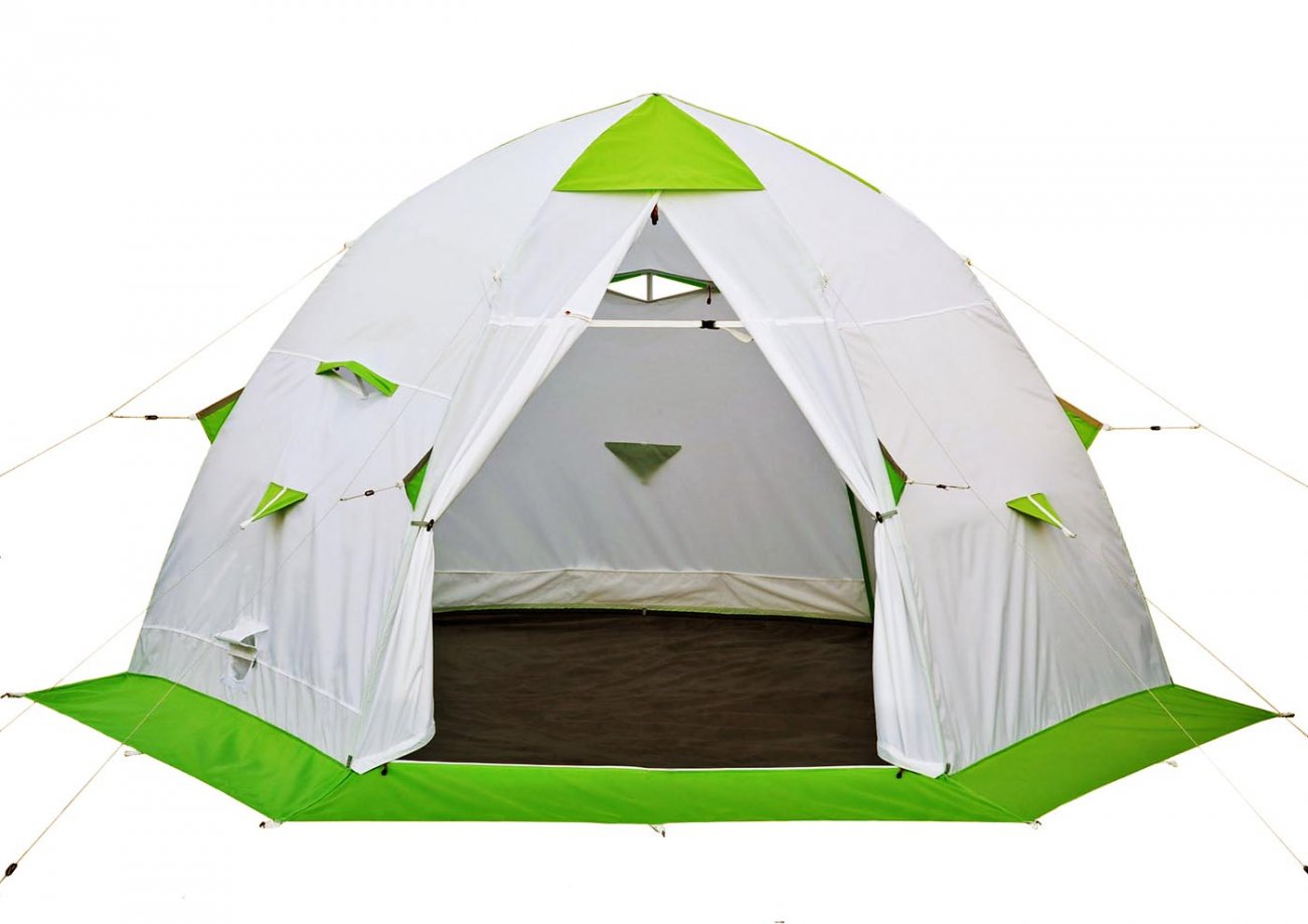 Высокая и просторная зимняя палатка ЛОТОС 5 с внутренней площадью 9 м? позволит разместить под своим куполом компанию заядлых рыбаков или охотников, состоящую из 3-5 человек.