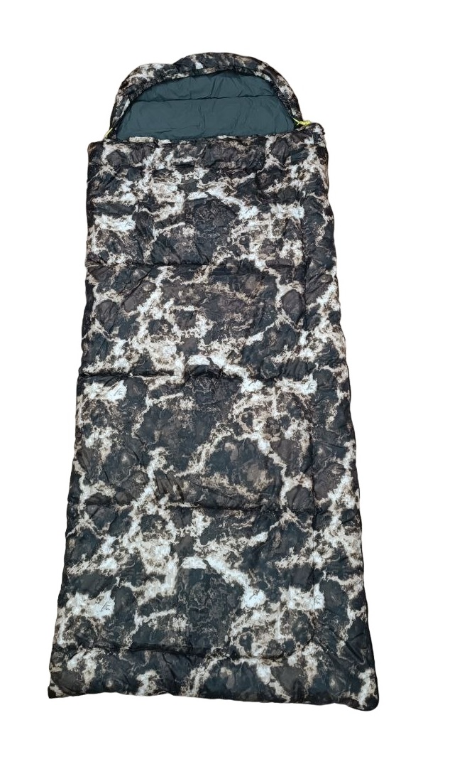Спальный мешок типа одеяло снабжен капюшоном с козырьком, затягивающимся стяжкой со стопором. Фиксатор – липучка на конце молнии.